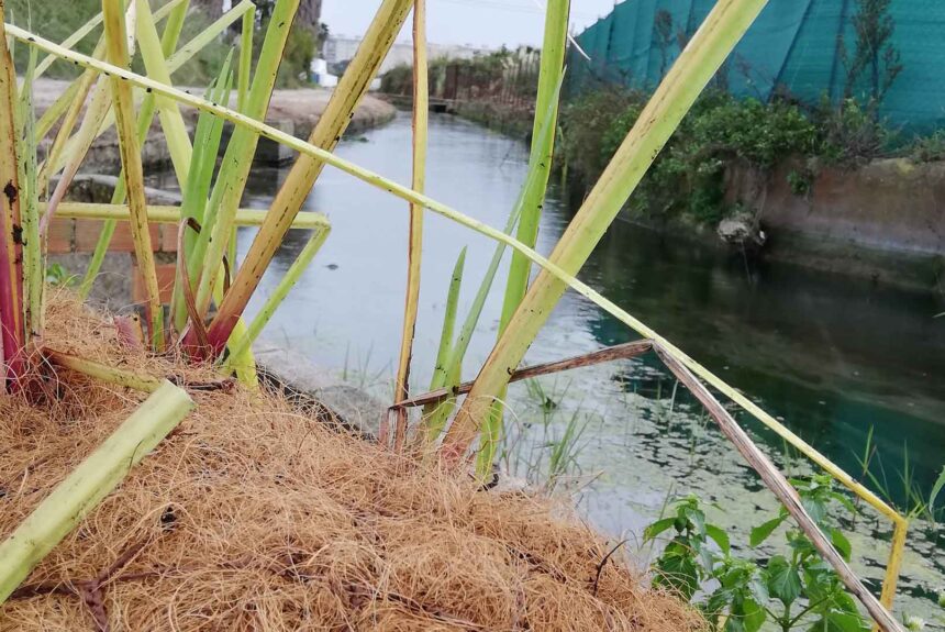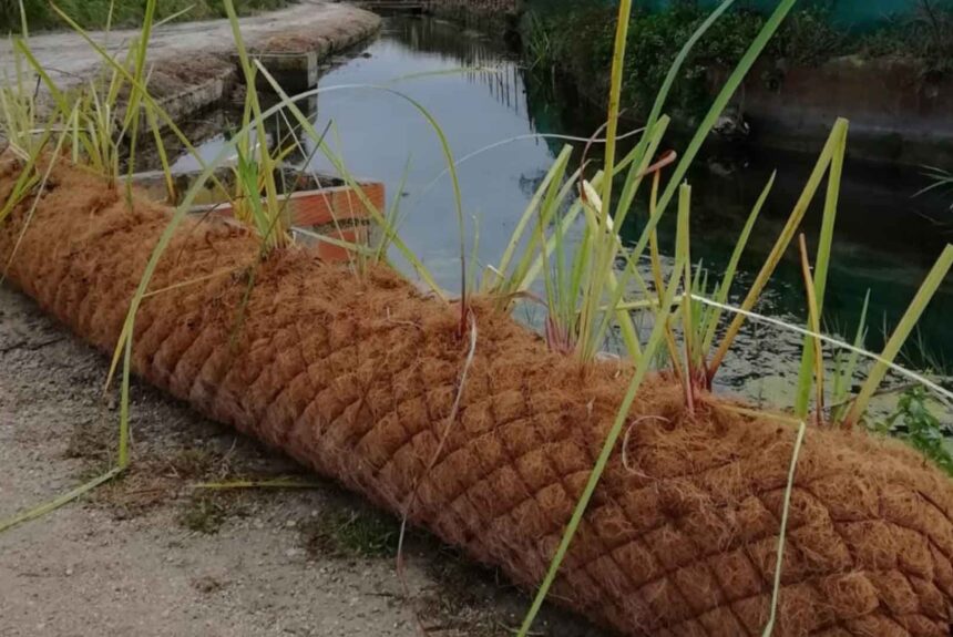 S’han col·locat biorolls de fibra de coco vegetats amb helòfits per estabilitzar els marges.